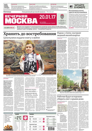 «Вечерняя Москва» — ежедневная российская вечерняя газета, старейшее из вечерних изданий в России, учрежденное в 1923 году. Выходит пять дней в неделю, кроме субботы и воскресенья. Отличается тем, что рассказывает о событиях еще не завершившегося дня. Оперативно освещает хронику и особенности жизни Москвы, охватывает все слои общества и большинство профессиональных и возрастных групп читателей.Издание представлено тремя выпусками – утренним ежедневным, вечерним (выходит три раза в неделю), еженедельным (выходит по четвергам).