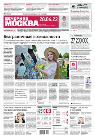 «Вечерняя Москва» — ежедневная российская вечерняя газета, старейшее из вечерних изданий в России, учрежденное в 1923 году. Выходит пять дней в неделю, кроме субботы и воскресенья. Отличается тем, что рассказывает о событиях еще не завершившегося дня. Оперативно освещает хронику и особенности жизни Москвы, охватывает все слои общества и большинство профессиональных и возрастных групп читателей.Издание представлено тремя выпусками – утренним ежедневным, вечерним (выходит три раза в неделю), еженедельным (выходит по четвергам).