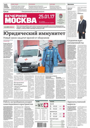 «Вечерняя Москва» — ежедневная российская вечерняя газета, старейшее из вечерних изданий в России, учрежденное в 1923 году. Выходит пять дней в неделю, кроме субботы и воскресенья. Отличается тем, что рассказывает о событиях еще не завершившегося дня. Оперативно освещает хронику и особенности жизни Москвы, охватывает все слои общества и большинство профессиональных и возрастных групп читателей.Издание представлено тремя выпусками – утренним ежедневным, вечерним (выходит три раза в неделю), еженедельным (выходит по четвергам).