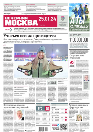 «Вечерняя Москва» — ежедневная российская вечерняя газета, старейшее из вечерних изданий в России, учрежденное в 1923 году. Выходит пять дней в неделю, кроме субботы и воскресенья. Отличается тем, что рассказывает о событиях еще не завершившегося дня. Оперативно освещает хронику и особенности жизни Москвы, охватывает все слои общества и большинство профессиональных и возрастных групп читателей.Издание представлено тремя выпусками – утренним ежедневным, вечерним (выходит три раза в неделю), еженедельным (выходит по четвергам).