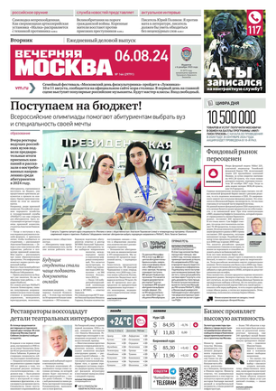 «Вечерняя Москва» — ежедневная российская вечерняя газета, старейшее из вечерних изданий в России, учрежденное в 1923 году. Выходит пять дней в неделю, кроме субботы и воскресенья. Отличается тем, что рассказывает о событиях еще не завершившегося дня. Оперативно освещает хронику и особенности жизни Москвы, охватывает все слои общества и большинство профессиональных и возрастных групп читателей.Издание представлено тремя выпусками – утренним ежедневным, вечерним (выходит три раза в неделю), еженедельным (выходит по четвергам).