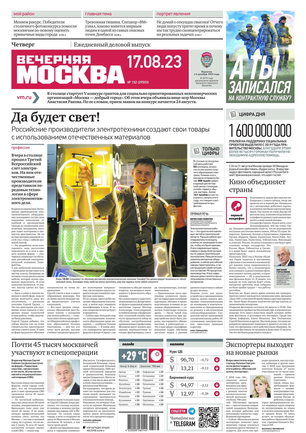 «Вечерняя Москва» — ежедневная российская вечерняя газета, старейшее из вечерних изданий в России, учрежденное в 1923 году. Выходит пять дней в неделю, кроме субботы и воскресенья. Отличается тем, что рассказывает о событиях еще не завершившегося дня. Оперативно освещает хронику и особенности жизни Москвы, охватывает все слои общества и большинство профессиональных и возрастных групп читателей.Издание представлено тремя выпусками – утренним ежедневным, вечерним (выходит три раза в неделю), еженедельным (выходит по четвергам).