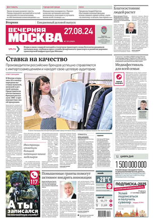 «Вечерняя Москва» — ежедневная российская вечерняя газета, старейшее из вечерних изданий в России, учрежденное в 1923 году. Выходит пять дней в неделю, кроме субботы и воскресенья. Отличается тем, что рассказывает о событиях еще не завершившегося дня. Оперативно освещает хронику и особенности жизни Москвы, охватывает все слои общества и большинство профессиональных и возрастных групп читателей.Издание представлено тремя выпусками – утренним ежедневным, вечерним (выходит три раза в неделю), еженедельным (выходит по четвергам).