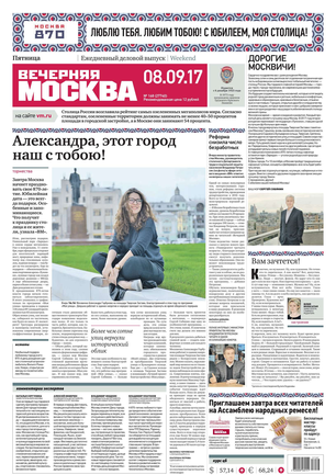 «Вечерняя Москва» — ежедневная российская вечерняя газета, старейшее из вечерних изданий в России, учрежденное в 1923 году. Выходит пять дней в неделю, кроме субботы и воскресенья. Отличается тем, что рассказывает о событиях еще не завершившегося дня. Оперативно освещает хронику и особенности жизни Москвы, охватывает все слои общества и большинство профессиональных и возрастных групп читателей.Издание представлено тремя выпусками – утренним ежедневным, вечерним (выходит три раза в неделю), еженедельным (выходит по четвергам).
