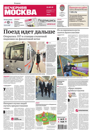 «Вечерняя Москва» — ежедневная российская вечерняя газета, старейшее из вечерних изданий в России, учрежденное в 1923 году. Выходит пять дней в неделю, кроме субботы и воскресенья. Отличается тем, что рассказывает о событиях еще не завершившегося дня. Оперативно освещает хронику и особенности жизни Москвы, охватывает все слои общества и большинство профессиональных и возрастных групп читателей.Издание представлено тремя выпусками – утренним ежедневным, вечерним (выходит три раза в неделю), еженедельным (выходит по четвергам).