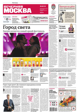 «Вечерняя Москва» — ежедневная российская вечерняя газета, старейшее из вечерних изданий в России, учрежденное в 1923 году. Выходит пять дней в неделю, кроме субботы и воскресенья. Отличается тем, что рассказывает о событиях еще не завершившегося дня. Оперативно освещает хронику и особенности жизни Москвы, охватывает все слои общества и большинство профессиональных и возрастных групп читателей.Издание представлено тремя выпусками – утренним ежедневным, вечерним (выходит три раза в неделю), еженедельным (выходит по четвергам).