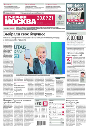 «Вечерняя Москва» — ежедневная российская вечерняя газета, старейшее из вечерних изданий в России, учрежденное в 1923 году. Выходит пять дней в неделю, кроме субботы и воскресенья. Отличается тем, что рассказывает о событиях еще не завершившегося дня. Оперативно освещает хронику и особенности жизни Москвы, охватывает все слои общества и большинство профессиональных и возрастных групп читателей.Издание представлено тремя выпусками – утренним ежедневным, вечерним (выходит три раза в неделю), еженедельным (выходит по четвергам).