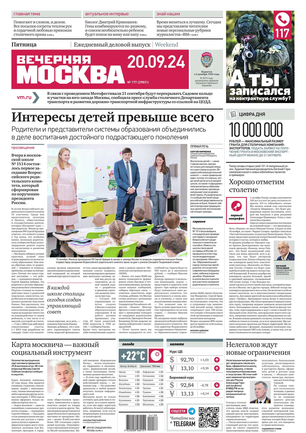 «Вечерняя Москва» — ежедневная российская вечерняя газета, старейшее из вечерних изданий в России, учрежденное в 1923 году. Выходит пять дней в неделю, кроме субботы и воскресенья. Отличается тем, что рассказывает о событиях еще не завершившегося дня. Оперативно освещает хронику и особенности жизни Москвы, охватывает все слои общества и большинство профессиональных и возрастных групп читателей.Издание представлено тремя выпусками – утренним ежедневным, вечерним (выходит три раза в неделю), еженедельным (выходит по четвергам).
