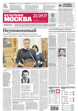 «Вечерняя Москва» — ежедневная российская вечерняя газета, старейшее из вечерних изданий в России, учрежденное в 1923 году. Выходит пять дней в неделю, кроме субботы и воскресенья. Отличается тем, что рассказывает о событиях еще не завершившегося дня. Оперативно освещает хронику и особенности жизни Москвы, охватывает все слои общества и большинство профессиональных и возрастных групп читателей.Издание представлено тремя выпусками – утренним ежедневным, вечерним (выходит три раза в неделю), еженедельным (выходит по четвергам).