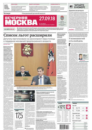 «Вечерняя Москва» — ежедневная российская вечерняя газета, старейшее из вечерних изданий в России, учрежденное в 1923 году. Выходит пять дней в неделю, кроме субботы и воскресенья. Отличается тем, что рассказывает о событиях еще не завершившегося дня. Оперативно освещает хронику и особенности жизни Москвы, охватывает все слои общества и большинство профессиональных и возрастных групп читателей.Издание представлено тремя выпусками – утренним ежедневным, вечерним (выходит три раза в неделю), еженедельным (выходит по четвергам).