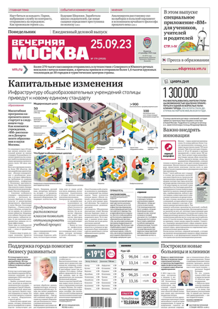 «Вечерняя Москва» — ежедневная российская вечерняя газета, старейшее из вечерних изданий в России, учрежденное в 1923 году. Выходит пять дней в неделю, кроме субботы и воскресенья. Отличается тем, что рассказывает о событиях еще не завершившегося дня. Оперативно освещает хронику и особенности жизни Москвы, охватывает все слои общества и большинство профессиональных и возрастных групп читателей.Издание представлено тремя выпусками – утренним ежедневным, вечерним (выходит три раза в неделю), еженедельным (выходит по четвергам).