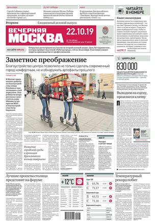 «Вечерняя Москва» — ежедневная российская вечерняя газета, старейшее из вечерних изданий в России, учрежденное в 1923 году. Выходит пять дней в неделю, кроме субботы и воскресенья. Отличается тем, что рассказывает о событиях еще не завершившегося дня. Оперативно освещает хронику и особенности жизни Москвы, охватывает все слои общества и большинство профессиональных и возрастных групп читателей.Издание представлено тремя выпусками – утренним ежедневным, вечерним (выходит три раза в неделю), еженедельным (выходит по четвергам).