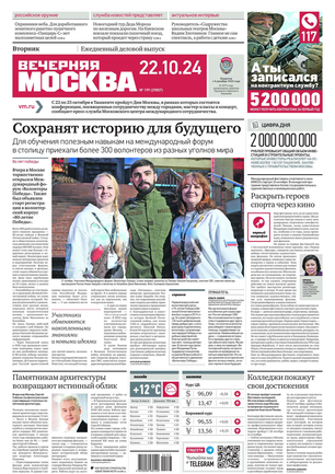 «Вечерняя Москва» — ежедневная российская вечерняя газета, старейшее из вечерних изданий в России, учрежденное в 1923 году. Выходит пять дней в неделю, кроме субботы и воскресенья. Отличается тем, что рассказывает о событиях еще не завершившегося дня. Оперативно освещает хронику и особенности жизни Москвы, охватывает все слои общества и большинство профессиональных и возрастных групп читателей.Издание представлено тремя выпусками – утренним ежедневным, вечерним (выходит три раза в неделю), еженедельным (выходит по четвергам).