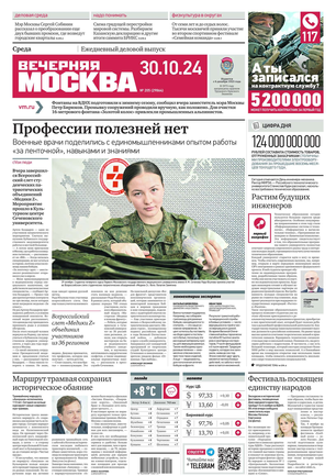 «Вечерняя Москва» — ежедневная российская вечерняя газета, старейшее из вечерних изданий в России, учрежденное в 1923 году. Выходит пять дней в неделю, кроме субботы и воскресенья. Отличается тем, что рассказывает о событиях еще не завершившегося дня. Оперативно освещает хронику и особенности жизни Москвы, охватывает все слои общества и большинство профессиональных и возрастных групп читателей.Издание представлено тремя выпусками – утренним ежедневным, вечерним (выходит три раза в неделю), еженедельным (выходит по четвергам).