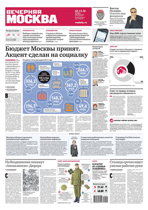 «Вечерняя Москва» — ежедневная российская вечерняя газета, старейшее из вечерних изданий в России, учрежденное в 1923 году. Выходит пять дней в неделю, кроме субботы и воскресенья. Отличается тем, что рассказывает о событиях еще не завершившегося дня. Оперативно освещает хронику и особенности жизни Москвы, охватывает все слои общества и большинство профессиональных и возрастных групп читателей.Издание представлено тремя выпусками – утренним ежедневным, вечерним (выходит три раза в неделю), еженедельным (выходит по четвергам).