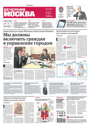 «Вечерняя Москва» — ежедневная российская вечерняя газета, старейшее из вечерних изданий в России, учрежденное в 1923 году. Выходит пять дней в неделю, кроме субботы и воскресенья. Отличается тем, что рассказывает о событиях еще не завершившегося дня. Оперативно освещает хронику и особенности жизни Москвы, охватывает все слои общества и большинство профессиональных и возрастных групп читателей.Издание представлено тремя выпусками – утренним ежедневным, вечерним (выходит три раза в неделю), еженедельным (выходит по четвергам).