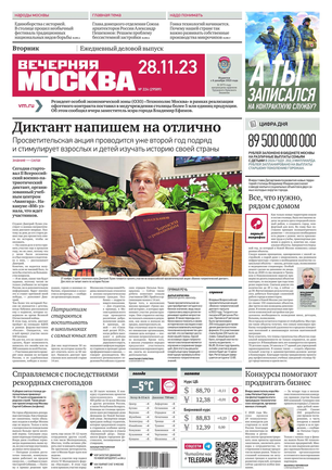 «Вечерняя Москва» — ежедневная российская вечерняя газета, старейшее из вечерних изданий в России, учрежденное в 1923 году. Выходит пять дней в неделю, кроме субботы и воскресенья. Отличается тем, что рассказывает о событиях еще не завершившегося дня. Оперативно освещает хронику и особенности жизни Москвы, охватывает все слои общества и большинство профессиональных и возрастных групп читателей.Издание представлено тремя выпусками – утренним ежедневным, вечерним (выходит три раза в неделю), еженедельным (выходит по четвергам).