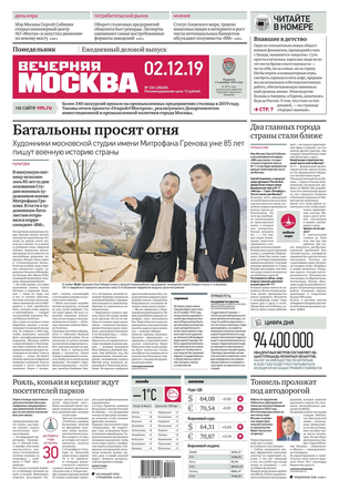 «Вечерняя Москва» — ежедневная российская вечерняя газета, старейшее из вечерних изданий в России, учрежденное в 1923 году. Выходит пять дней в неделю, кроме субботы и воскресенья. Отличается тем, что рассказывает о событиях еще не завершившегося дня. Оперативно освещает хронику и особенности жизни Москвы, охватывает все слои общества и большинство профессиональных и возрастных групп читателей.Издание представлено тремя выпусками – утренним ежедневным, вечерним (выходит три раза в неделю), еженедельным (выходит по четвергам).