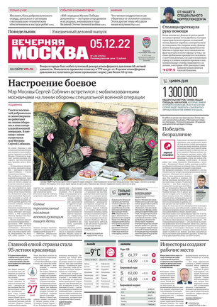 «Вечерняя Москва» — ежедневная российская вечерняя газета, старейшее из вечерних изданий в России, учрежденное в 1923 году. Выходит пять дней в неделю, кроме субботы и воскресенья. Отличается тем, что рассказывает о событиях еще не завершившегося дня. Оперативно освещает хронику и особенности жизни Москвы, охватывает все слои общества и большинство профессиональных и возрастных групп читателей.Издание представлено тремя выпусками – утренним ежедневным, вечерним (выходит три раза в неделю), еженедельным (выходит по четвергам).