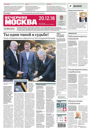 «Вечерняя Москва» — ежедневная российская вечерняя газета, старейшее из вечерних изданий в России, учрежденное в 1923 году. Выходит пять дней в неделю, кроме субботы и воскресенья. Отличается тем, что рассказывает о событиях еще не завершившегося дня. Оперативно освещает хронику и особенности жизни Москвы, охватывает все слои общества и большинство профессиональных и возрастных групп читателей.Издание представлено тремя выпусками – утренним ежедневным, вечерним (выходит три раза в неделю), еженедельным (выходит по четвергам).