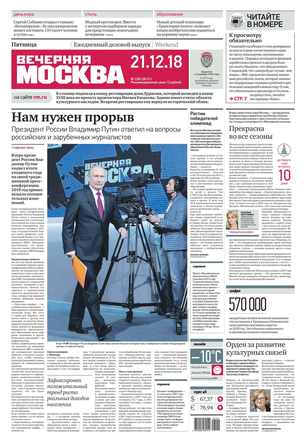 «Вечерняя Москва» — ежедневная российская вечерняя газета, старейшее из вечерних изданий в России, учрежденное в 1923 году. Выходит пять дней в неделю, кроме субботы и воскресенья. Отличается тем, что рассказывает о событиях еще не завершившегося дня. Оперативно освещает хронику и особенности жизни Москвы, охватывает все слои общества и большинство профессиональных и возрастных групп читателей.Издание представлено тремя выпусками – утренним ежедневным, вечерним (выходит три раза в неделю), еженедельным (выходит по четвергам).