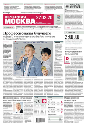 «Вечерняя Москва» — ежедневная российская вечерняя газета, старейшее из вечерних изданий в России, учрежденное в 1923 году. Выходит пять дней в неделю, кроме субботы и воскресенья. Отличается тем, что рассказывает о событиях еще не завершившегося дня. Оперативно освещает хронику и особенности жизни Москвы, охватывает все слои общества и большинство профессиональных и возрастных групп читателей.Издание представлено тремя выпусками – утренним ежедневным, вечерним (выходит три раза в неделю), еженедельным (выходит по четвергам).
