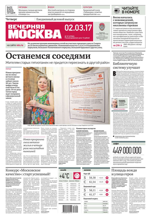«Вечерняя Москва» — ежедневная российская вечерняя газета, старейшее из вечерних изданий в России, учрежденное в 1923 году. Выходит пять дней в неделю, кроме субботы и воскресенья. Отличается тем, что рассказывает о событиях еще не завершившегося дня. Оперативно освещает хронику и особенности жизни Москвы, охватывает все слои общества и большинство профессиональных и возрастных групп читателей.Издание представлено тремя выпусками – утренним ежедневным, вечерним (выходит три раза в неделю), еженедельным (выходит по четвергам).