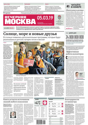 «Вечерняя Москва» — ежедневная российская вечерняя газета, старейшее из вечерних изданий в России, учрежденное в 1923 году. Выходит пять дней в неделю, кроме субботы и воскресенья. Отличается тем, что рассказывает о событиях еще не завершившегося дня. Оперативно освещает хронику и особенности жизни Москвы, охватывает все слои общества и большинство профессиональных и возрастных групп читателей.Издание представлено тремя выпусками – утренним ежедневным, вечерним (выходит три раза в неделю), еженедельным (выходит по четвергам).