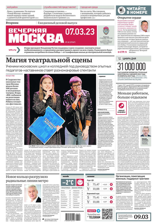 «Вечерняя Москва» — ежедневная российская вечерняя газета, старейшее из вечерних изданий в России, учрежденное в 1923 году. Выходит пять дней в неделю, кроме субботы и воскресенья. Отличается тем, что рассказывает о событиях еще не завершившегося дня. Оперативно освещает хронику и особенности жизни Москвы, охватывает все слои общества и большинство профессиональных и возрастных групп читателей.Издание представлено тремя выпусками – утренним ежедневным, вечерним (выходит три раза в неделю), еженедельным (выходит по четвергам).