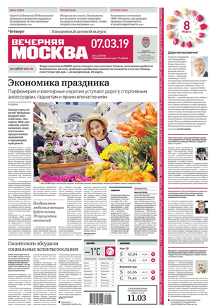 «Вечерняя Москва» — ежедневная российская вечерняя газета, старейшее из вечерних изданий в России, учрежденное в 1923 году. Выходит пять дней в неделю, кроме субботы и воскресенья. Отличается тем, что рассказывает о событиях еще не завершившегося дня. Оперативно освещает хронику и особенности жизни Москвы, охватывает все слои общества и большинство профессиональных и возрастных групп читателей.Издание представлено тремя выпусками – утренним ежедневным, вечерним (выходит три раза в неделю), еженедельным (выходит по четвергам).