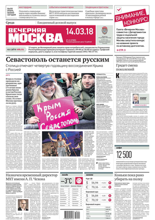 «Вечерняя Москва» — ежедневная российская вечерняя газета, старейшее из вечерних изданий в России, учрежденное в 1923 году. Выходит пять дней в неделю, кроме субботы и воскресенья. Отличается тем, что рассказывает о событиях еще не завершившегося дня. Оперативно освещает хронику и особенности жизни Москвы, охватывает все слои общества и большинство профессиональных и возрастных групп читателей.Издание представлено тремя выпусками – утренним ежедневным, вечерним (выходит три раза в неделю), еженедельным (выходит по четвергам).