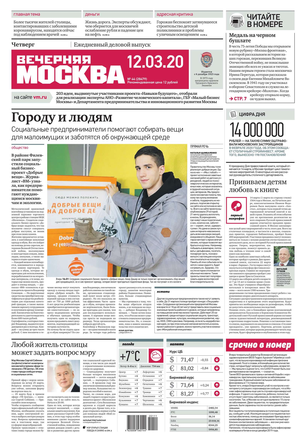 «Вечерняя Москва» — ежедневная российская вечерняя газета, старейшее из вечерних изданий в России, учрежденное в 1923 году. Выходит пять дней в неделю, кроме субботы и воскресенья. Отличается тем, что рассказывает о событиях еще не завершившегося дня. Оперативно освещает хронику и особенности жизни Москвы, охватывает все слои общества и большинство профессиональных и возрастных групп читателей.Издание представлено тремя выпусками – утренним ежедневным, вечерним (выходит три раза в неделю), еженедельным (выходит по четвергам).
