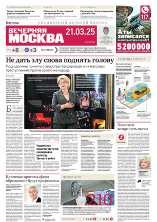 «Вечерняя Москва» — ежедневная российская вечерняя газета, старейшее из вечерних изданий в России, учрежденное в 1923 году. Выходит пять дней в неделю, кроме субботы и воскресенья. Отличается тем, что рассказывает о событиях еще не завершившегося дня. Оперативно освещает хронику и особенности жизни Москвы, охватывает все слои общества и большинство профессиональных и возрастных групп читателей.Издание представлено тремя выпусками – утренним ежедневным, вечерним (выходит три раза в неделю), еженедельным (выходит по четвергам).