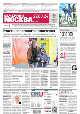 «Вечерняя Москва» — ежедневная российская вечерняя газета, старейшее из вечерних изданий в России, учрежденное в 1923 году. Выходит пять дней в неделю, кроме субботы и воскресенья. Отличается тем, что рассказывает о событиях еще не завершившегося дня. Оперативно освещает хронику и особенности жизни Москвы, охватывает все слои общества и большинство профессиональных и возрастных групп читателей.Издание представлено тремя выпусками – утренним ежедневным, вечерним (выходит три раза в неделю), еженедельным (выходит по четвергам).