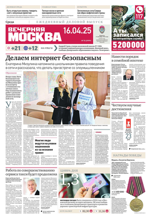 «Вечерняя Москва» — ежедневная российская вечерняя газета, старейшее из вечерних изданий в России, учрежденное в 1923 году. Выходит пять дней в неделю, кроме субботы и воскресенья. Отличается тем, что рассказывает о событиях еще не завершившегося дня. Оперативно освещает хронику и особенности жизни Москвы, охватывает все слои общества и большинство профессиональных и возрастных групп читателей.Издание представлено тремя выпусками – утренним ежедневным, вечерним (выходит три раза в неделю), еженедельным (выходит по четвергам).