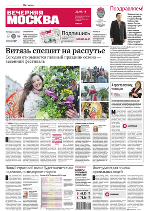 «Вечерняя Москва» — ежедневная российская вечерняя газета, старейшее из вечерних изданий в России, учрежденное в 1923 году. Выходит пять дней в неделю, кроме субботы и воскресенья. Отличается тем, что рассказывает о событиях еще не завершившегося дня. Оперативно освещает хронику и особенности жизни Москвы, охватывает все слои общества и большинство профессиональных и возрастных групп читателей.Издание представлено тремя выпусками – утренним ежедневным, вечерним (выходит три раза в неделю), еженедельным (выходит по четвергам).