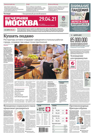«Вечерняя Москва» — ежедневная российская вечерняя газета, старейшее из вечерних изданий в России, учрежденное в 1923 году. Выходит пять дней в неделю, кроме субботы и воскресенья. Отличается тем, что рассказывает о событиях еще не завершившегося дня. Оперативно освещает хронику и особенности жизни Москвы, охватывает все слои общества и большинство профессиональных и возрастных групп читателей.Издание представлено тремя выпусками – утренним ежедневным, вечерним (выходит три раза в неделю), еженедельным (выходит по четвергам).